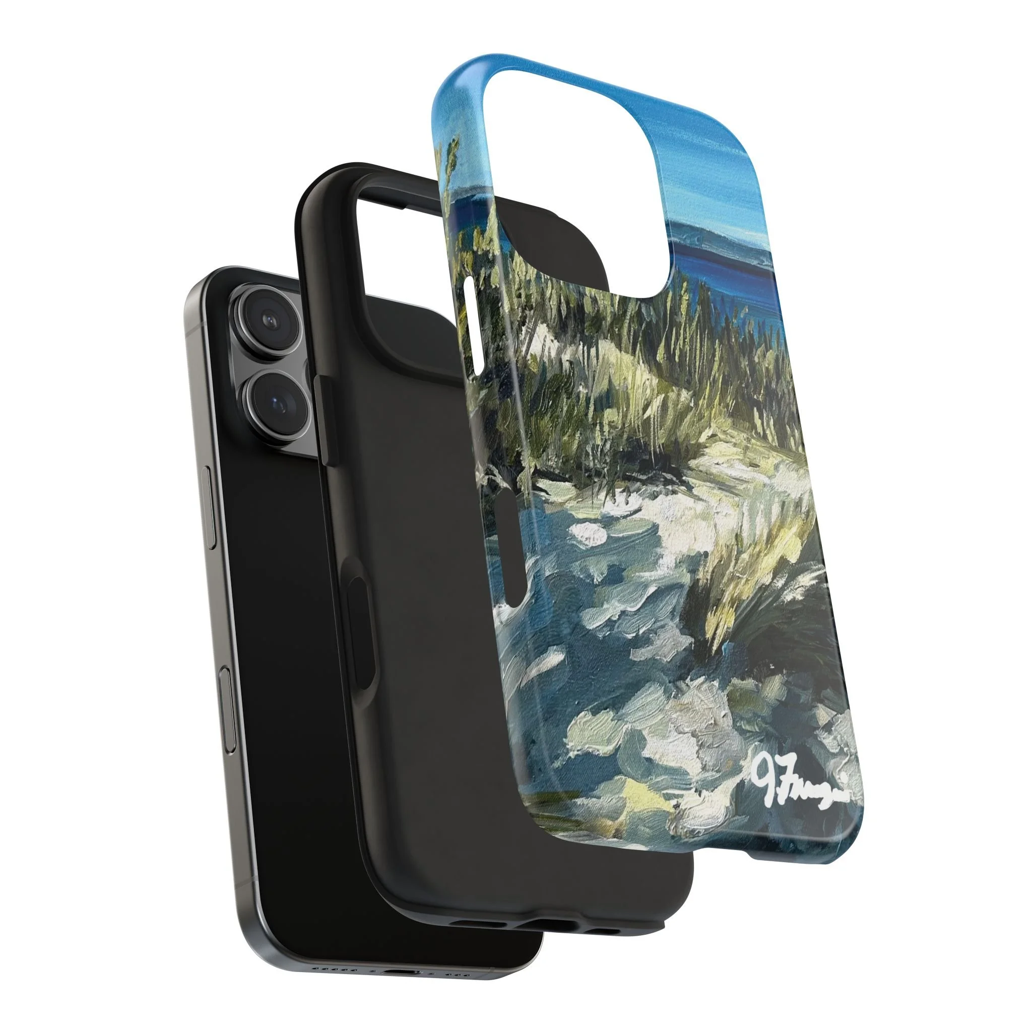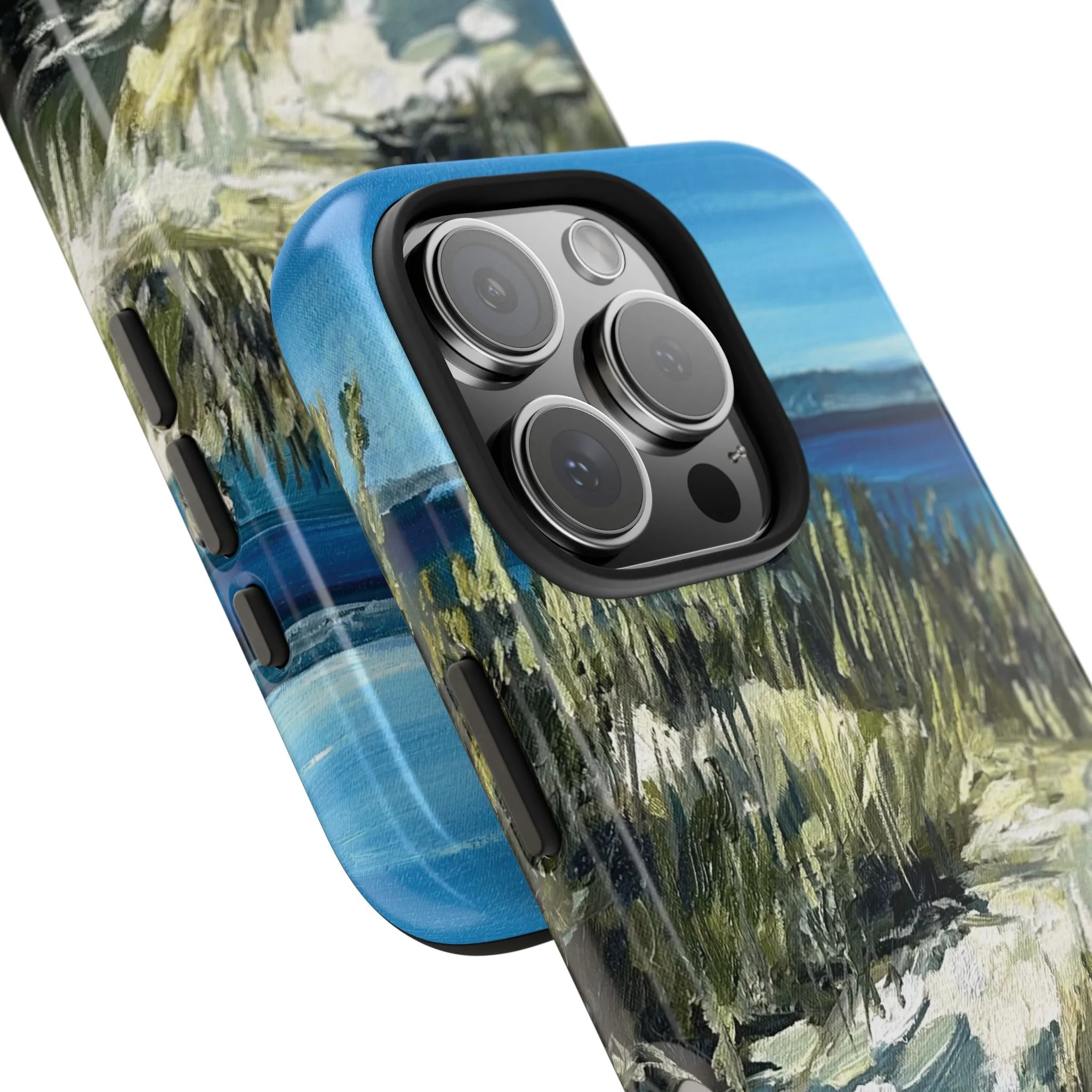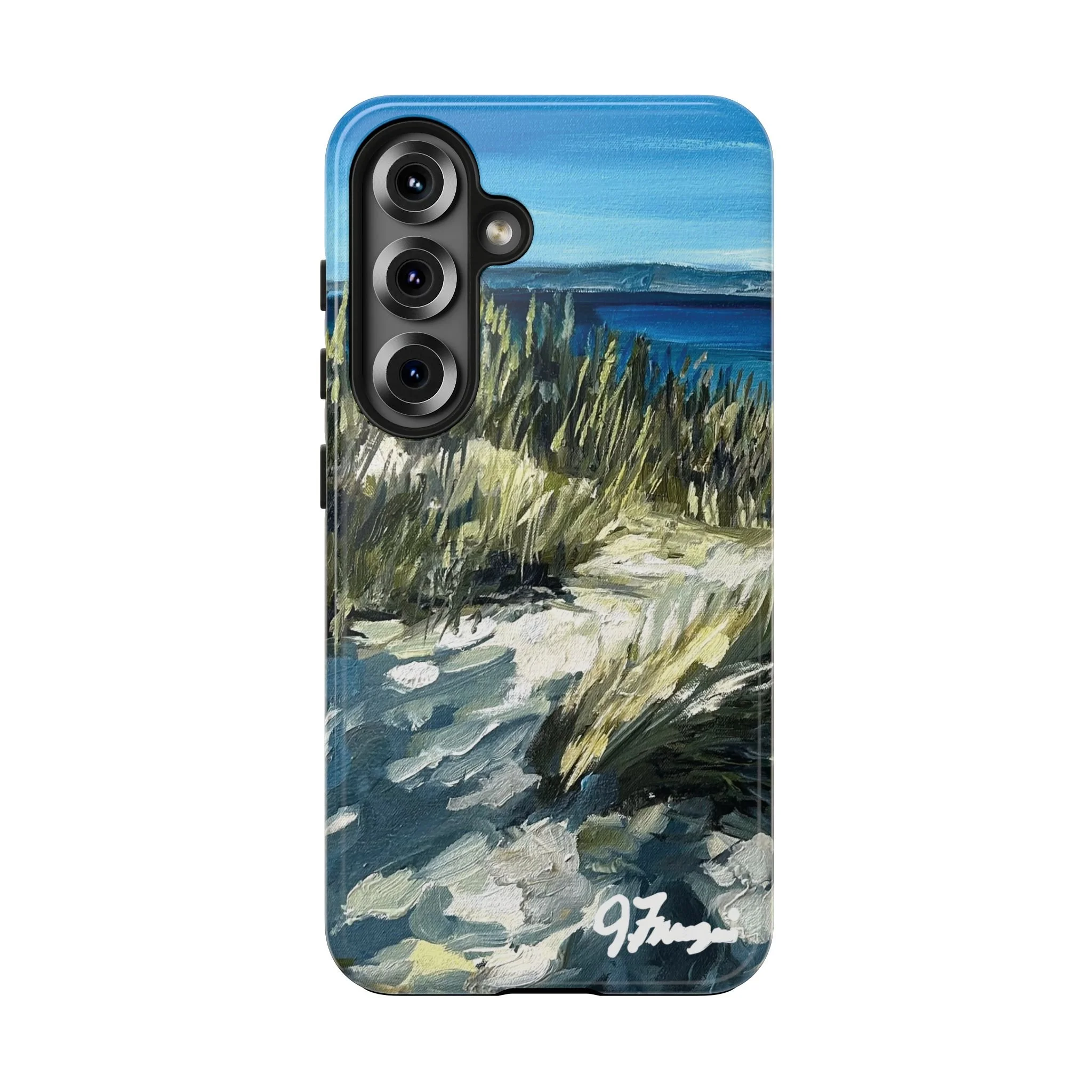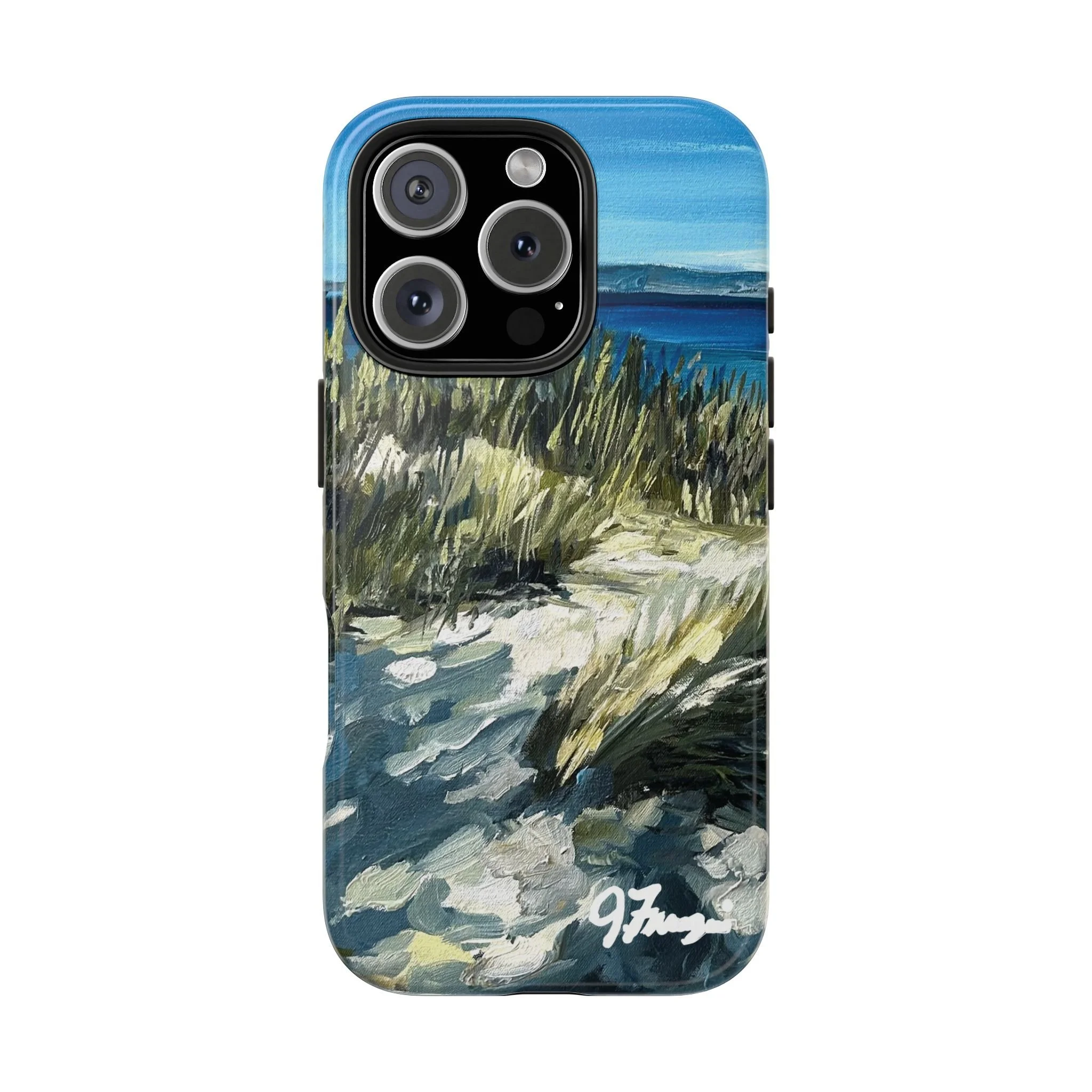 A rugged, artful phone case that brings the hush of Sleeping Bear dunes to your everyday carry. Hand-painted brushstrokes of sea grass, sand, and surf flow across a glossy polycarbonate shell, so each glance feels like a breath of fresh air. The two-piece construction — a tough outer Lexan shell and flexible TPU liner — cushions drops and disperses impact while a lay-flat bezel guards the screen. UV protection keeps the colors vivid through beach days and bright commutes. Lightweight and wireless-charging compatible, this case fits naturally into active, outdoorsy lives without sacrificing painterly detail.