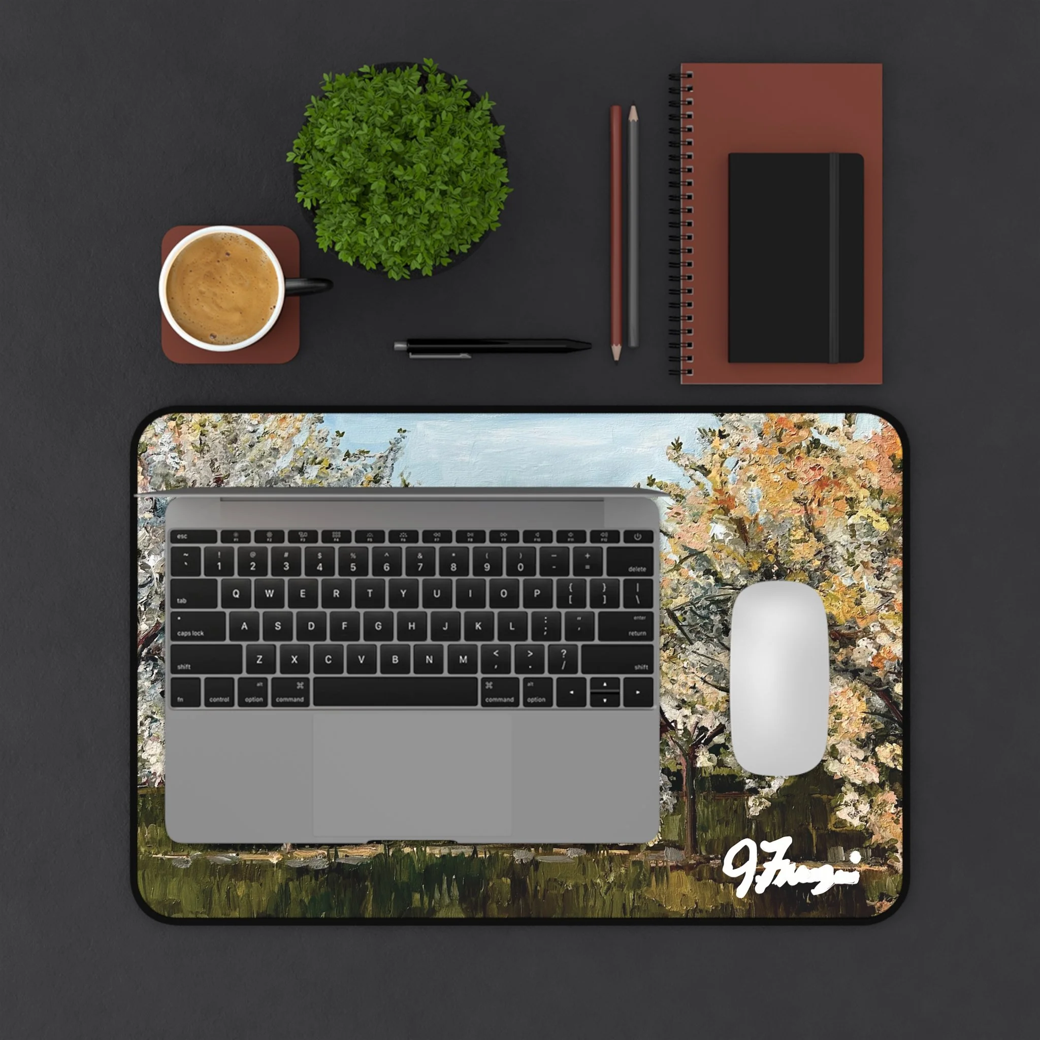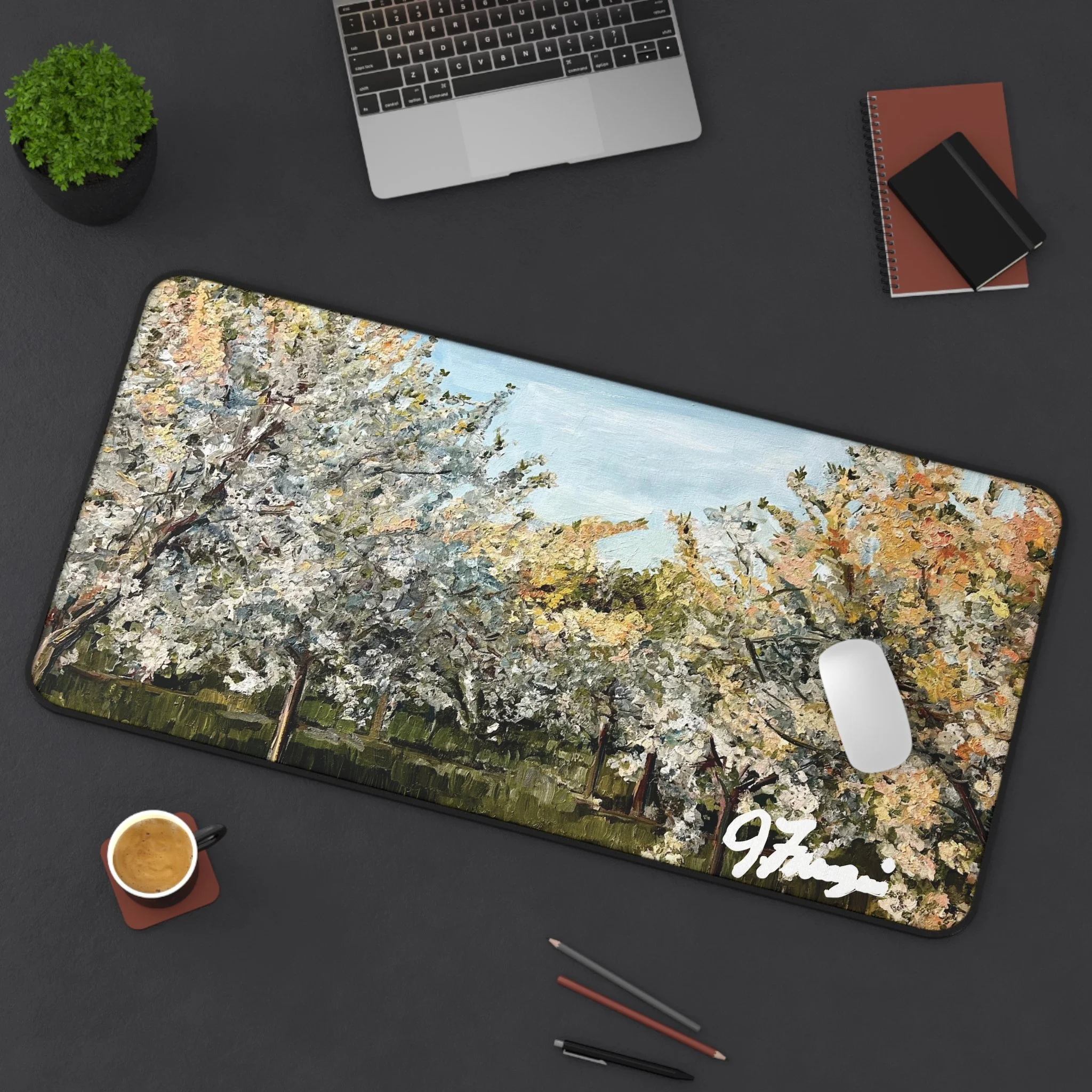 Find a quiet corner and let this neoprene desk mat bring a breath of orchard air to your workspace. Soft brushstrokes of white blossoms and warm greens settle under your keyboard and sketchbook, turning routine tasks into small, calm rituals. The textured surface keeps pens steady, the stitched edges resist fraying, and the non-slip backing holds the scene firmly in place while you work, write, or craft. It’s the kind of detail that makes a desk feel cared for — a visual pause between meetings, deadlines, and late-night ideas.